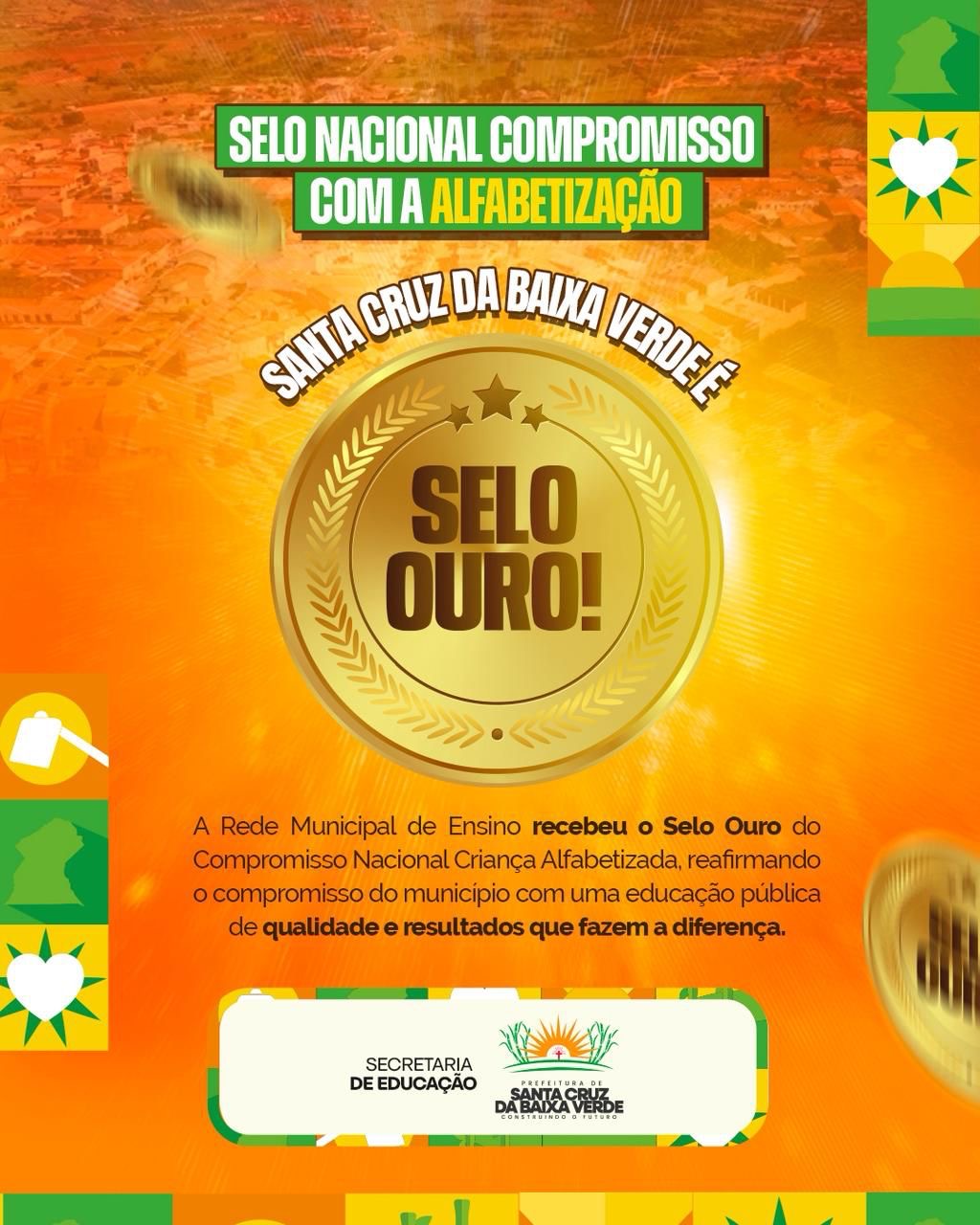 O município de Santa Cruz da Baixa Verde conquistou o Selo Ouro do Compromisso Nacional Criança Alfabetizada (CNCA), iniciativa do Ministério da Educação que reconhece o esforço de estados e municípios na garantia da alfabetização na idade certa. Nesta edição, Santa Cruz da Baixa Verde alcançou 139 pontos na avaliação dos indicadores do MEC, desempenho