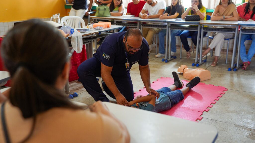 A capacitação foi conduzida por enfermeiros e estudantes da Faculdade FAMA, que repassaram orientações fundamentais e técnicas de primeiros socorros aplicáveis em situações de emergência tanto no ambiente doméstico quanto escolar.