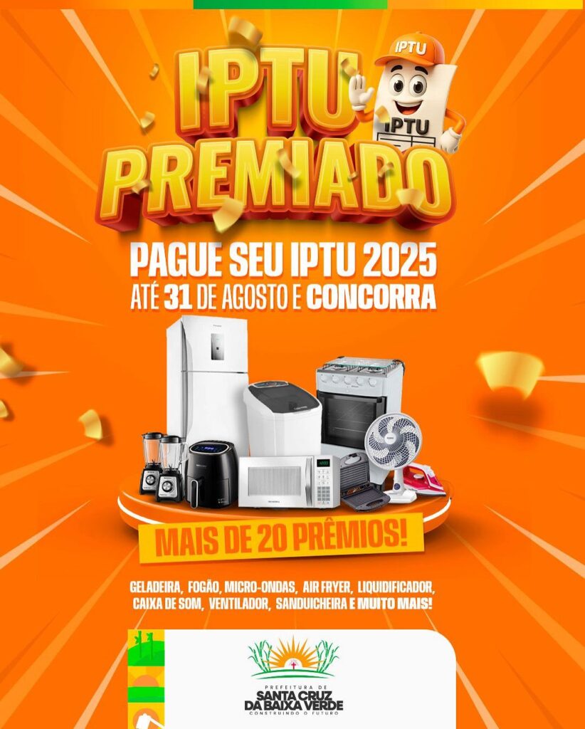 A Prefeitura de Santa Cruz da Baixa Verde lançou oficialmente a campanha do IPTU Premiado 2025, uma iniciativa que visa estimular o pagamento em dia do Imposto Predial e Territorial Urbano e, ao mesmo tempo, valorizar o contribuinte com a oferta de mais de 20 prêmios. A ação contempla eletrodomésticos e outros itens de utilidade doméstica, visando a arrecadação responsável e o retorno de benefícios à população.